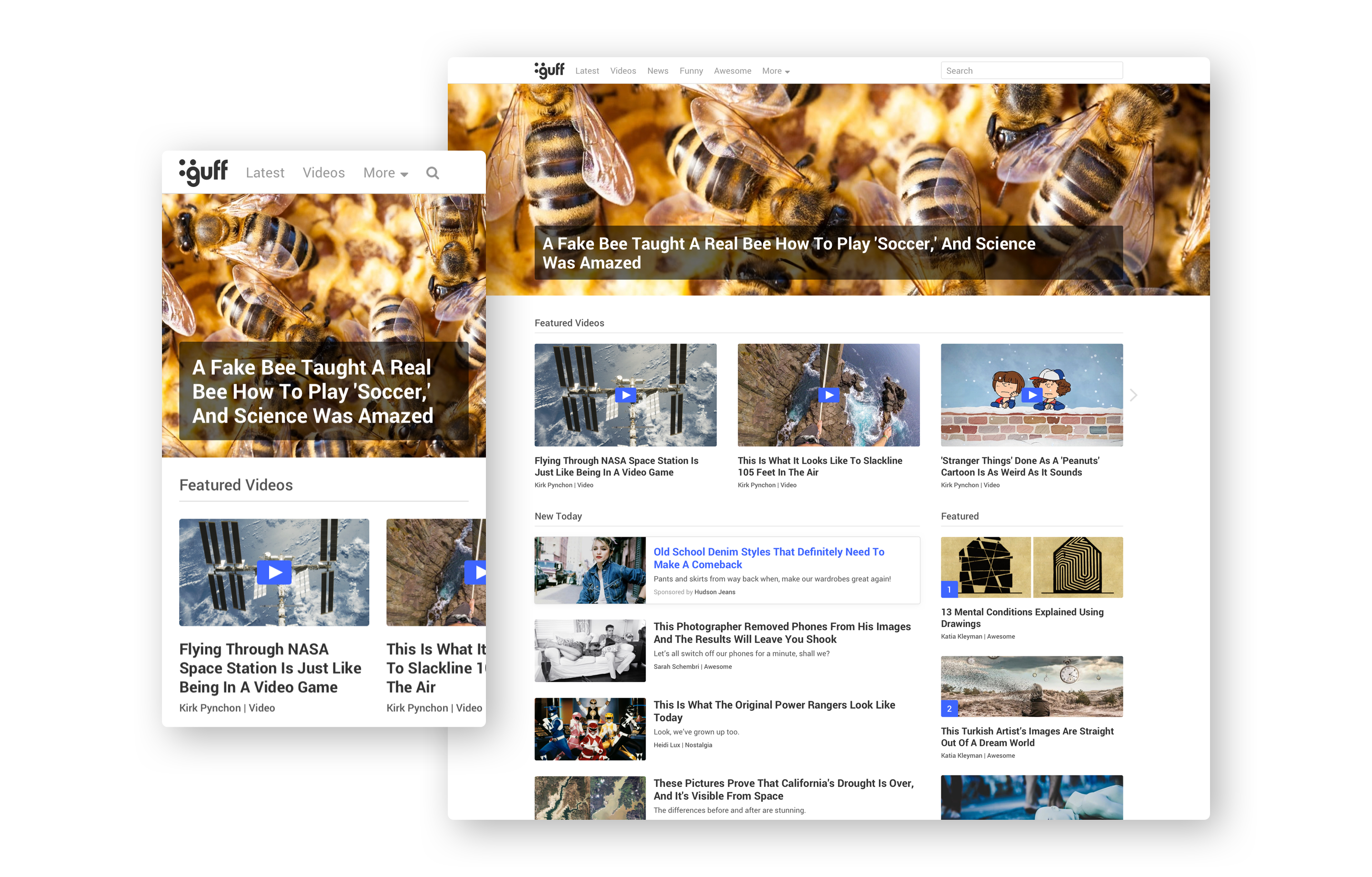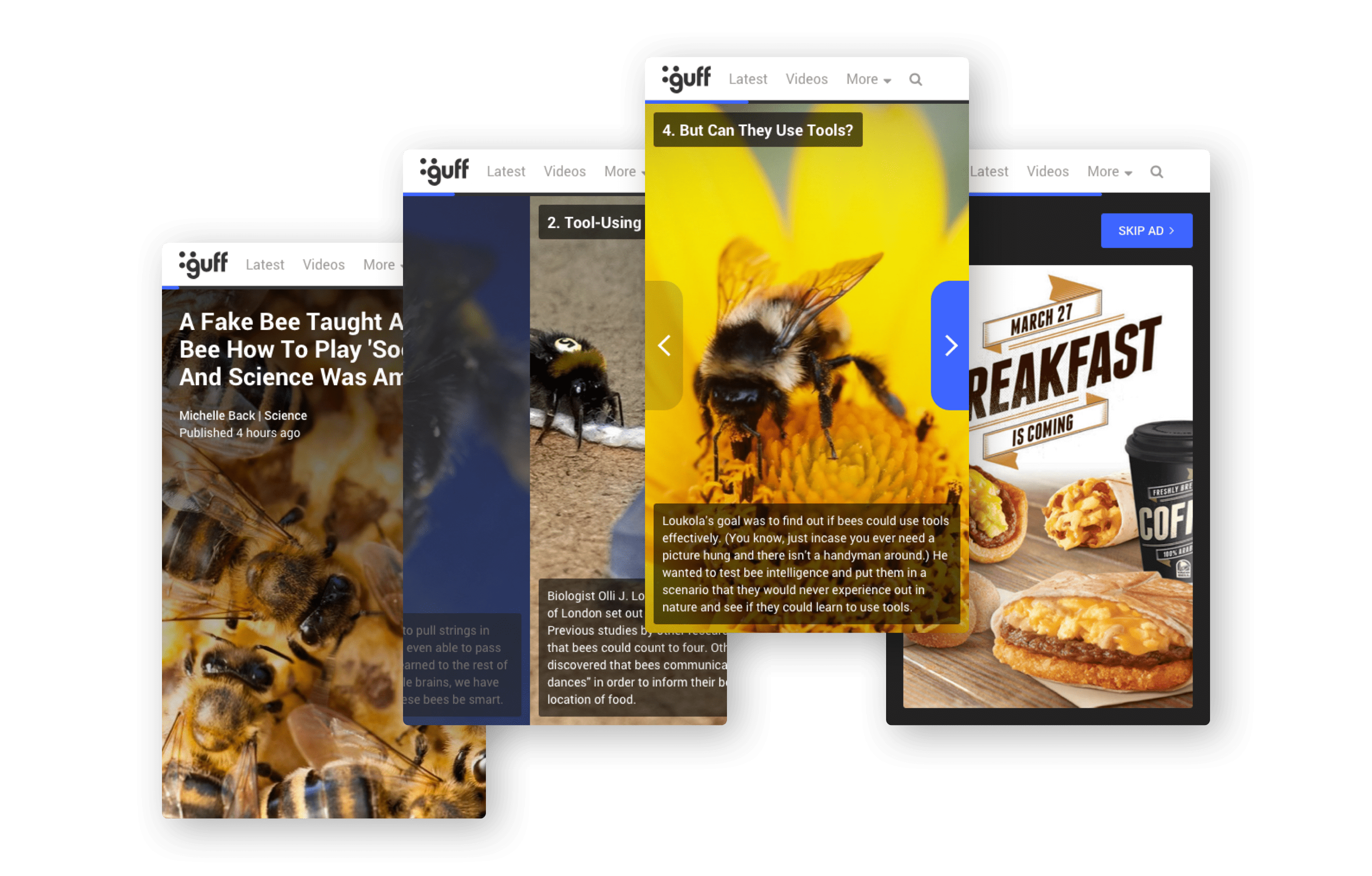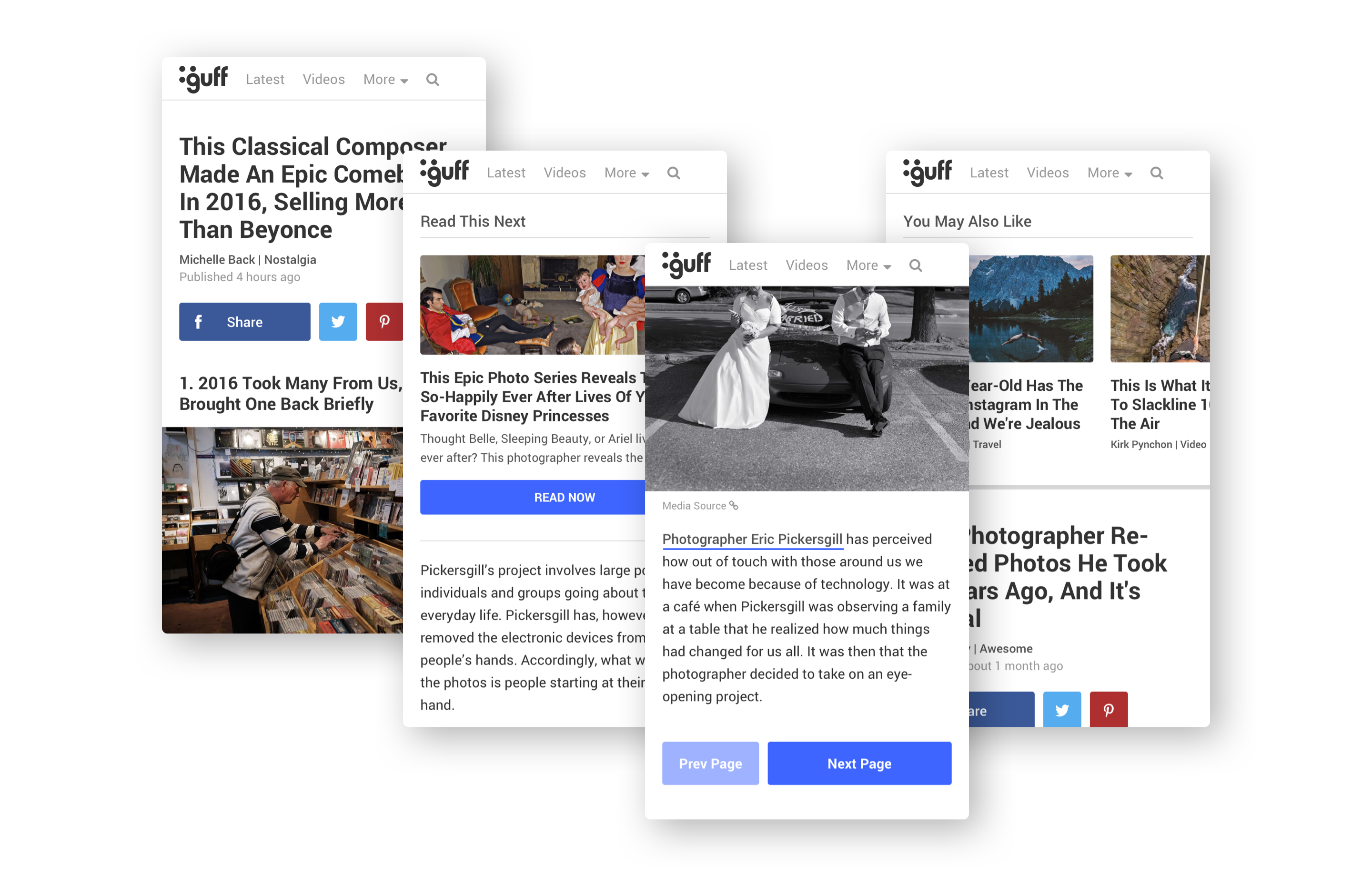 Using modular elements, I created a design system that could be easily adjusted and rearranged so that we could efficiently run A/B tests on layouts while maintaining a consistent look and feel for the user. This allowed for quick iterations and improvements, yielding significant upsides to Guff’s core metrics. Most notably, average time-on-site increased to over 4 minutes (+88%) across the publishing network. Not only has this drastically improved monetization potential on-site, but it has also allowed Guff to acquire more traffic as Facebook openly values time-on-site as a key engagement metric.